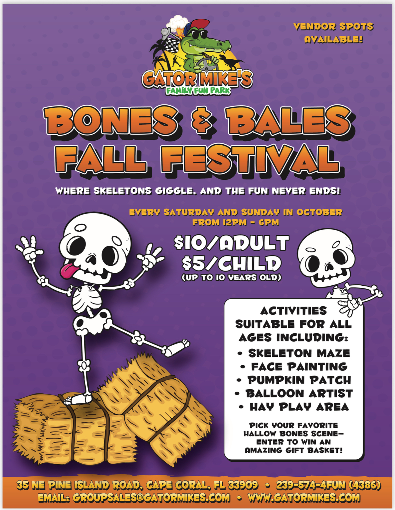 The Bones & Bales Fall Festival! Enjoy Skeleton Mazes, Face Painting, Pumpkin Patches, Vendors, Baloon Artists, A Hay Bale play area and SOO MUCH more! Every Saturday & Sunday in October from 12pm-6pm | $10.00 Adult Admission – $5.00 Children’s Admission. Vendor Spots & Sponsorships are still available – Email: Groupsales@gatormikes.com for sign up & more information!