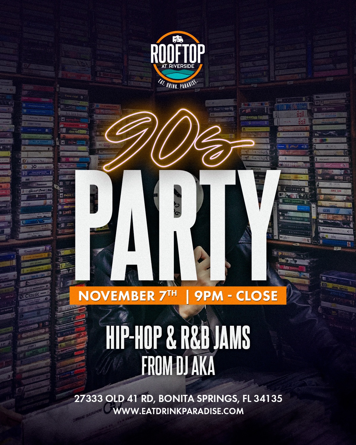 Rooftop at Riverside 27333 Old 41 Rd, Bonita Springs, FLIt’s throwback time! Join us for our 90s Party featuring DJ Aka spinning the best hip-hop and R&B from the decade that defined a generation. Let’s take it back, old […]